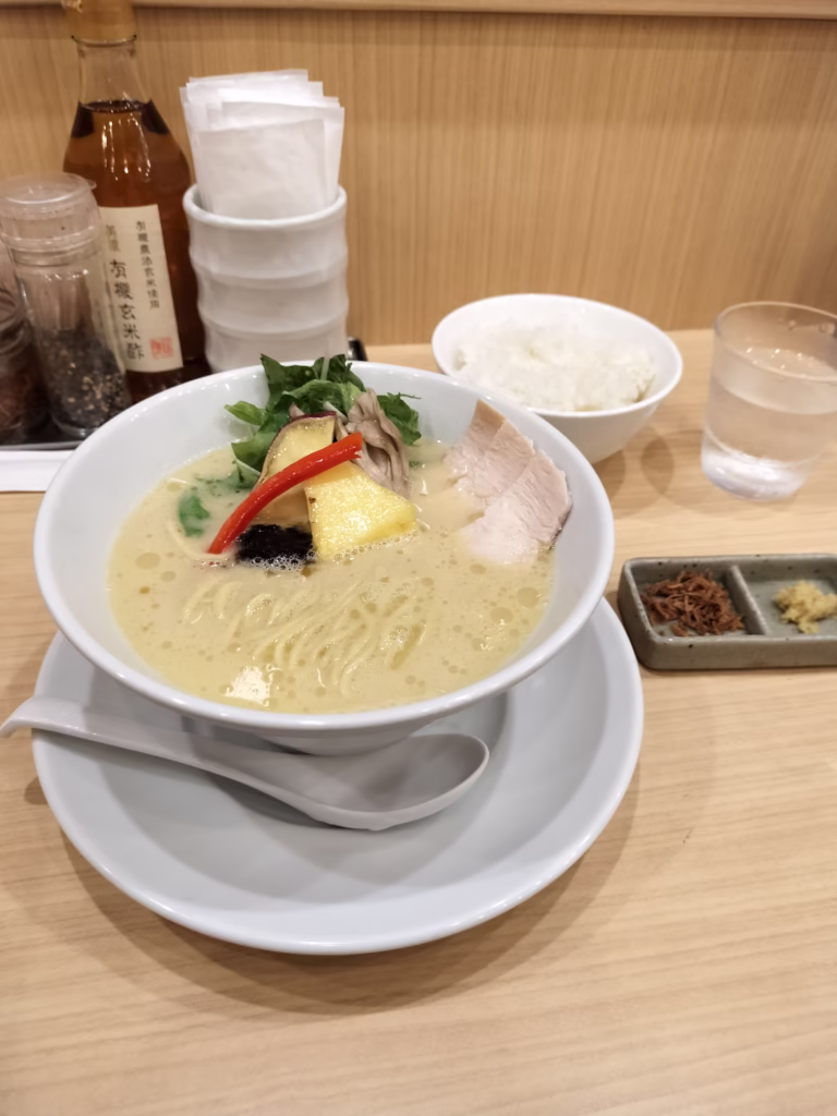 At exactly 12:10 PM, the bowl arrived—a vision in creamy white that immediately commanded attention in the concrete jungle of Otemachi. The first sip established what systematic comparison with other tori paitan establishments had already suggested: Kagari operates on an entirely different level.