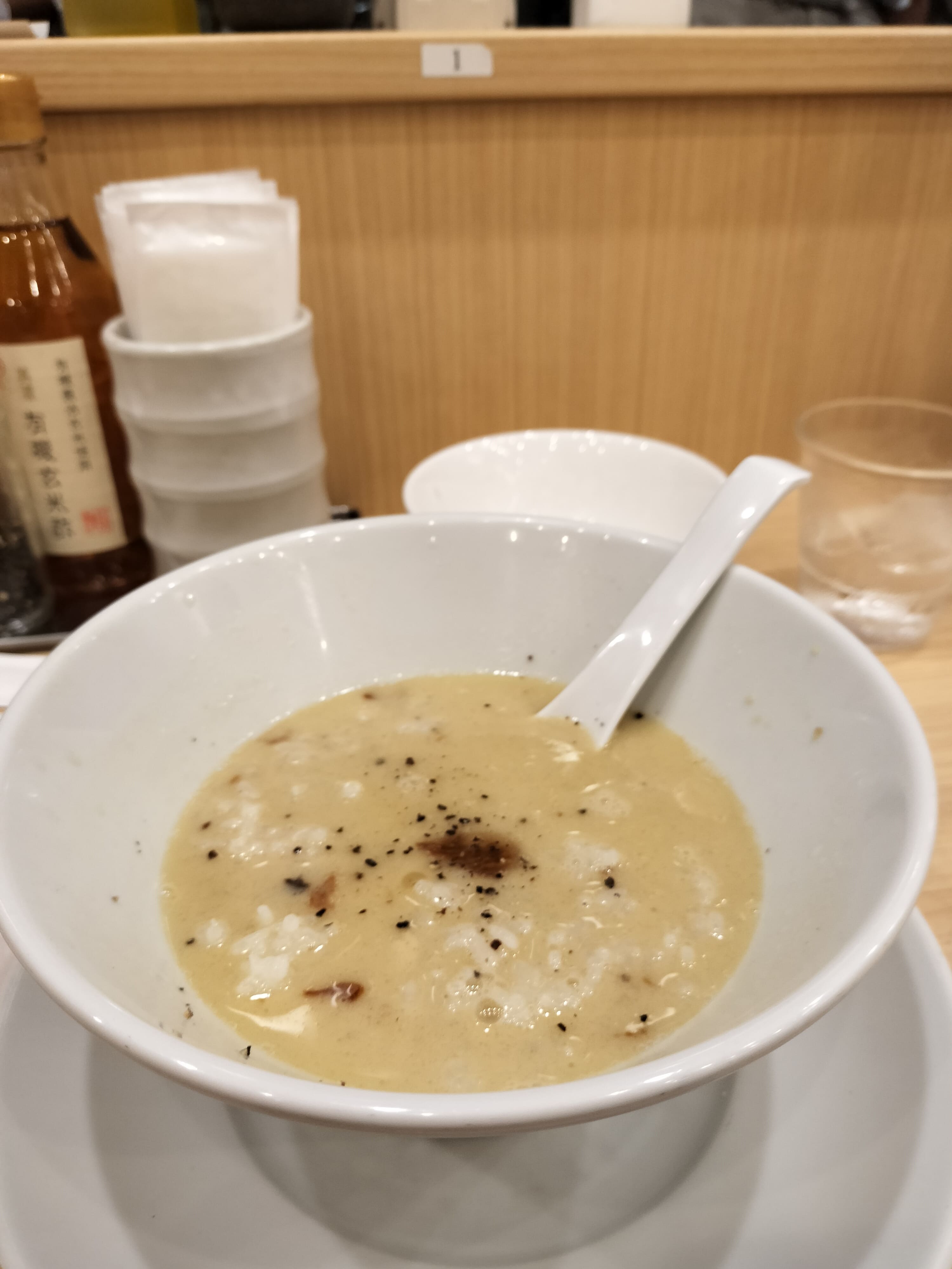 With noodles consumed and precious broth remaining, the investigation’s true purpose revealed itself. The white rice—ordered with deliberate intent—underwent its transformation. The entire contents poured into the remaining tori paitan soup, a light dusting of black pepper added for complexity.