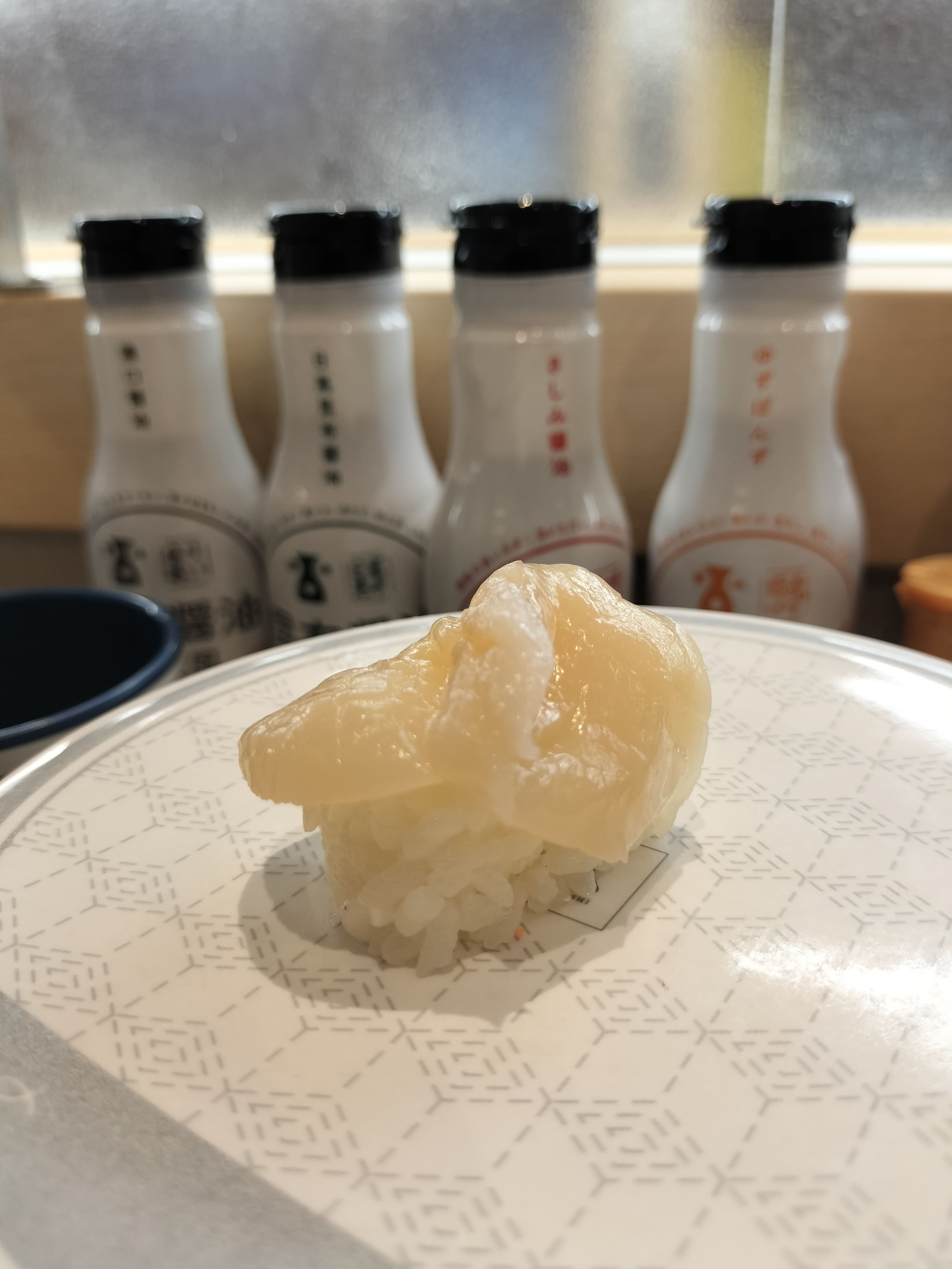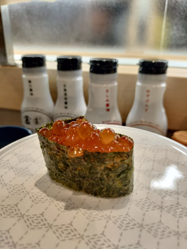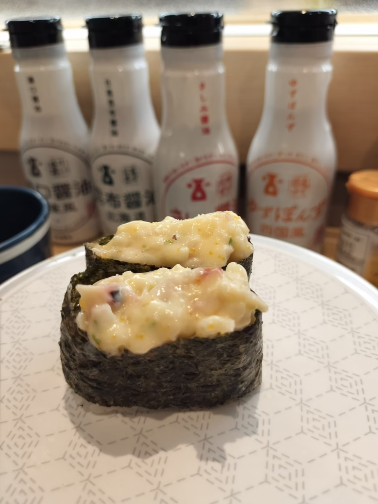 Innovation Analysis: Hot fried shrimp nigiri topped with tartar sauce. The sauce’s acidity complements the vinegared rice while the crispy texture provides perfect contrast. This exemplifies how conveyor belt sushi chains create entirely new sushi categories.