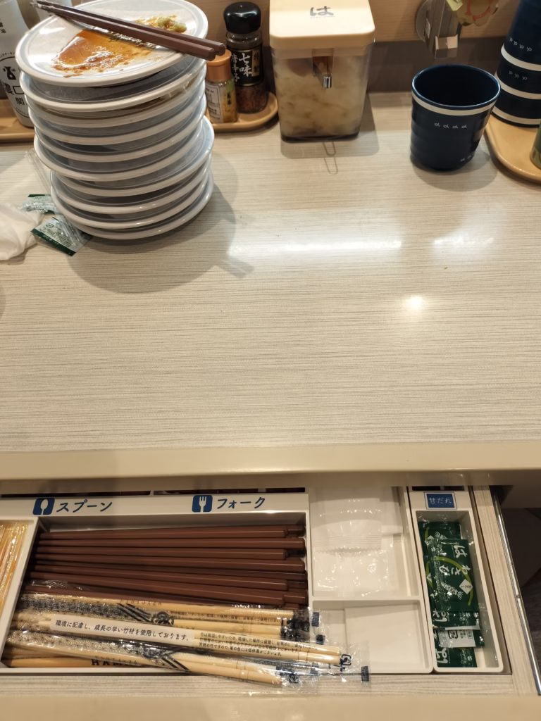 The table setup demonstrates thoughtful attention to the complete dining experience. Several varieties of soy sauce are available for different sushi types, alongside pickled ginger (gari) for palate cleansing. The self-service tea station allows customers to prepare their own green tea by adding powdered tea to cups and drawing hot water from the dedicated tap. Most conveniently, each seat includes a drawer containing chopsticks, individual wasabi tubes, and wet towels (oshibori) for hand cleaning.