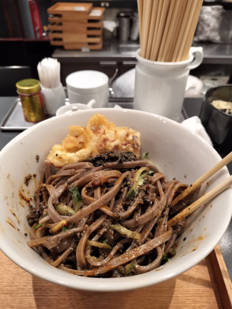 In the polished district of Marunouchi, a short walk from Tokyo Station, Suju Masayuki Raku serves a singular style of noodle: thick-cut, rustic, country-style soba (futo-uchi inaka soba). I have investigated this establishment multiple times, analyzing their various preparations—tempura soba, oroshi soba, standard dipping sauces. While the quality was evident, a paradox remained: the thick, firm noodles seemed to fight against the delicate, traditional accompaniments.