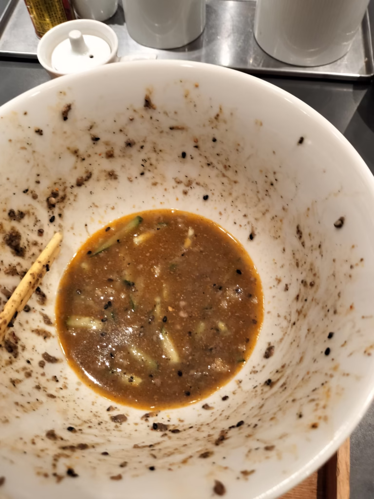 Watch as the remaining meat-miso paste dissolves, transforming into a creamy, tan-colored soup. The result resembles a Japanese-style tantan soup: savory, warming, with that same sesame-forward profile but now softened and diluted to a drinkable consistency.